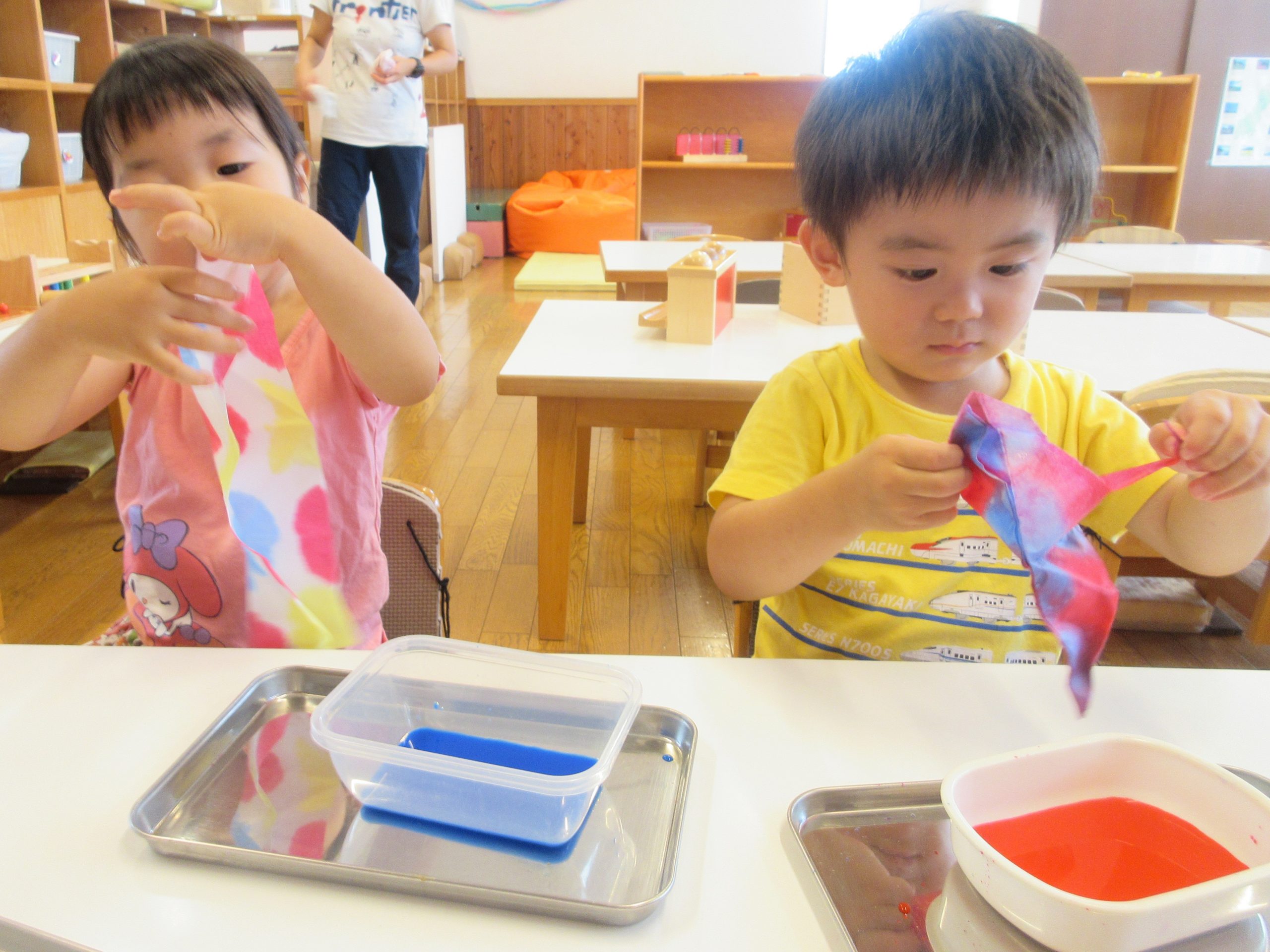 2歳児・ひばりぐみの子どもたちは、初めて染め紙をしました。障子紙を三角形になるように重ね折りをして、赤・黄・青の色水を用意し「そっとつけてごらん」
