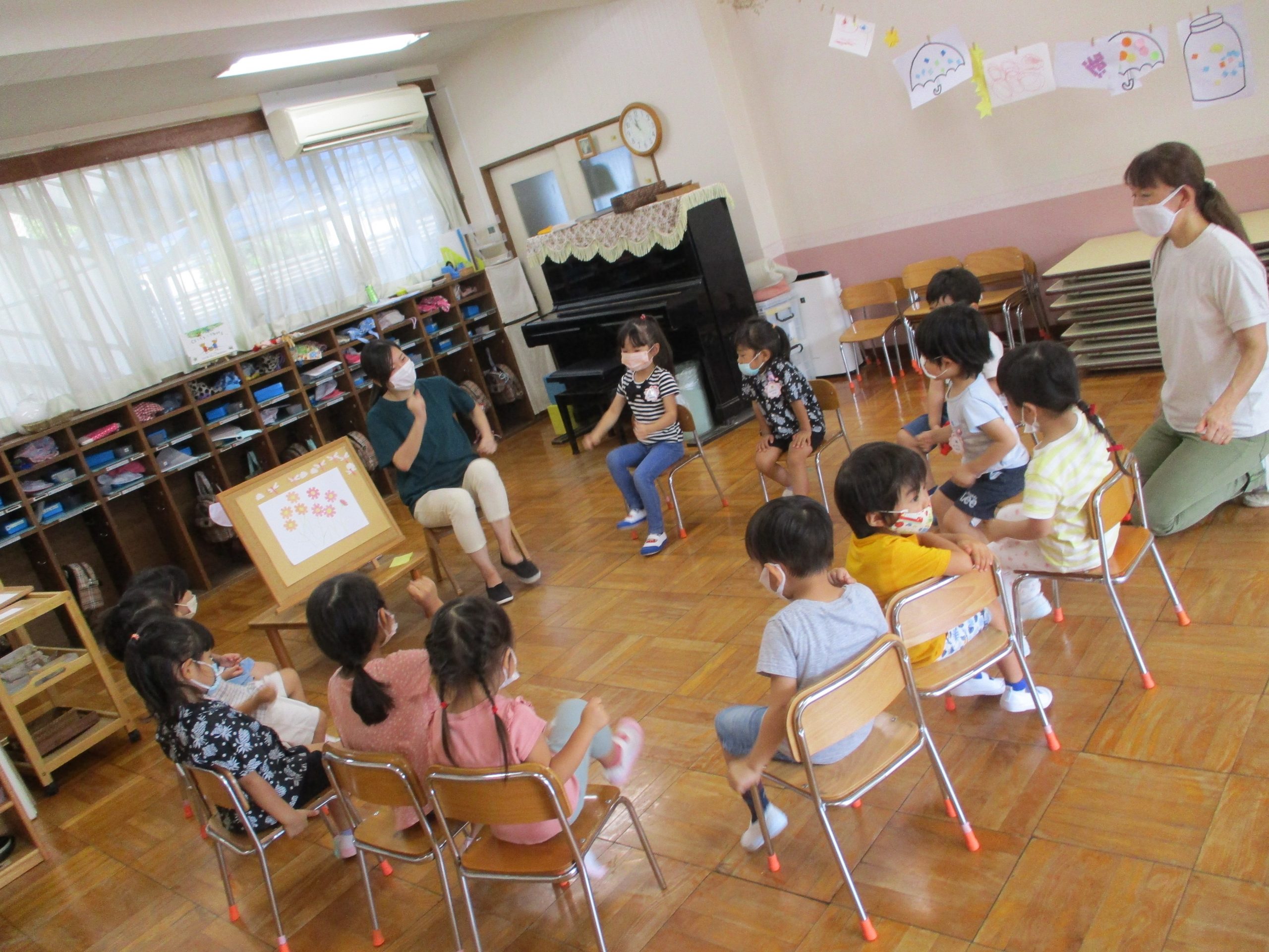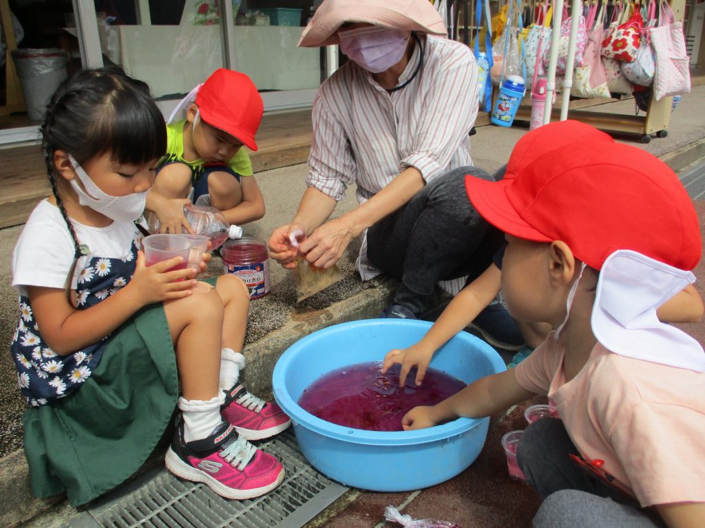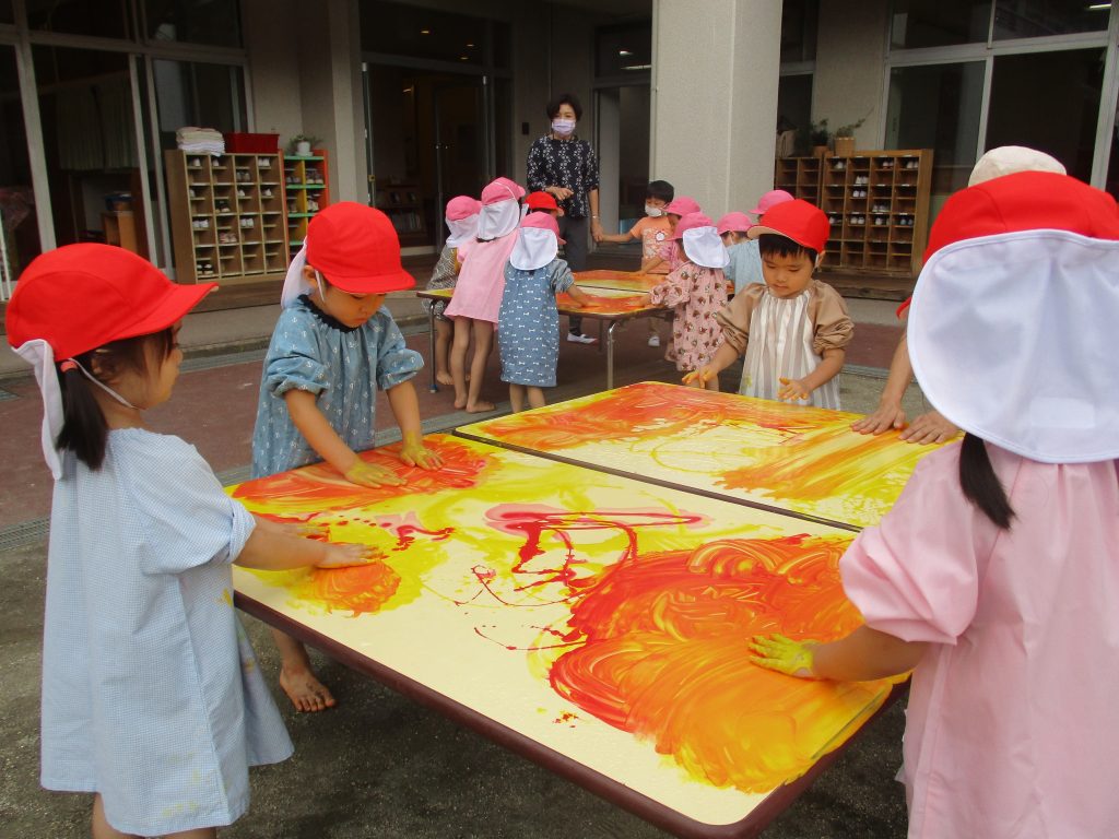年少ぐみ ゆったり のんびり 幼稚園トピックス 2021.09.17 幼稚園トピックス 9月は分散登園となり、年少ぐみはグループに分かれ、少ない人数でゆったりのんびり過ごしております。 色みずあそびや、固定遊具などのやりたいあそびを、先生や友だちとじっくりたのしんでいます。 晴れた日に、外でフィンガーペインティングを行い、「ぬるぬるして気もちいいね」「オレンジになったよ」などと絵の具の感触や色の変化をたのしみました。 今のゆったりした時間を大切に、1人ひとりの興味や関心をより広げていきたいと思います。