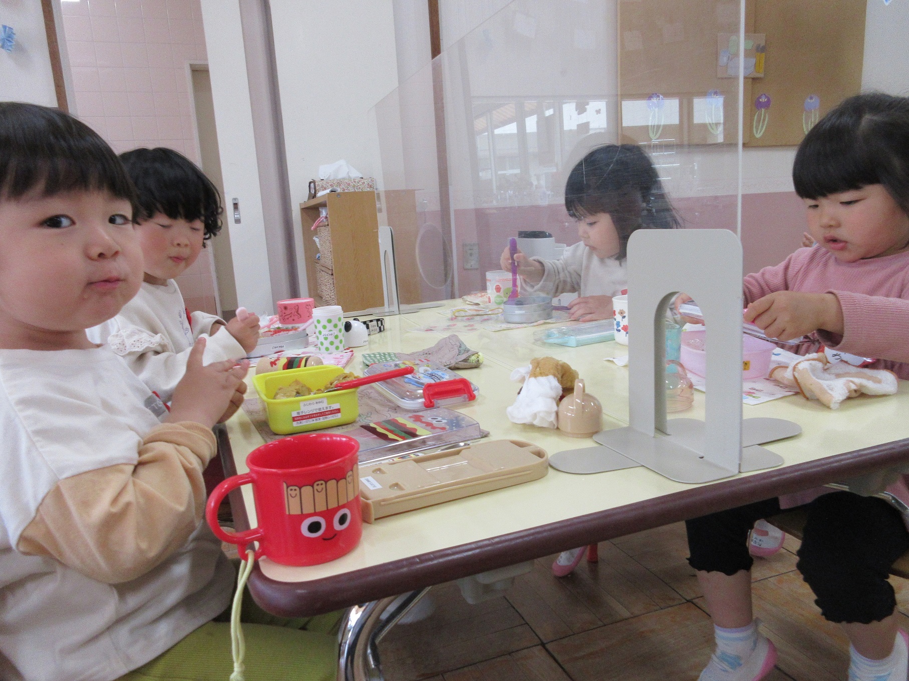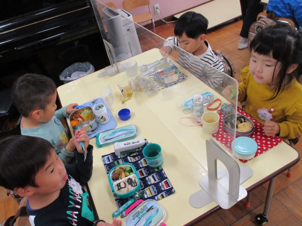 おべんとうおいしいね 幼稚園トピックス 2022.05.23 幼稚園トピックス 年少の子どもたちは、連休明けからお弁当がはじまりました。 登園してくると、「今日はクラスでお弁当を食べるの?」「なにが入っているかな」とお弁当の時間を心待ちにしている姿が、とてもかわいらしかったです。作ってくれたおうちの方や厨房の方に感謝し、お友だちと一緒に食べるうれしさを感じながら、みんなでお弁当をいただいています。食事の時間も大切にしながら見守っていきたいと思います。