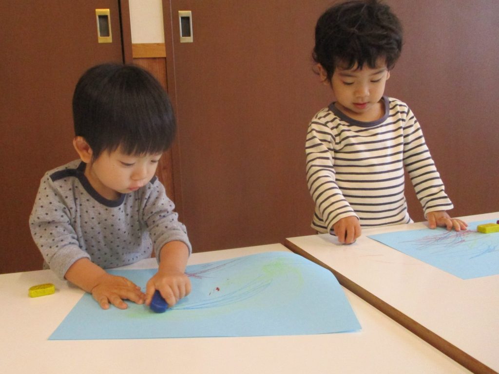 1歳児・すみれぐみの子どもたちは、みつろうクレヨンでお絵描きをしました。おとなが画用紙を並べて準備をしていると「やりたい、やりたい!」とパーテーションの向こうには意欲満々の姿が。赤・青・黄色のブロッククレヨンを一人ずつ画用紙の上に置いてもらうと、子どもたちはさっそく好きな色から手に取って描き始めました。「カキカキ」「マルマル~」と左右に腕を大きく動かして描いたり、トントンとクレヨンを打ち付けて、紙に色が付くのを楽しんでいました。描くことに夢中になっている子どもたちの世界を大切に見守っていきたいです。