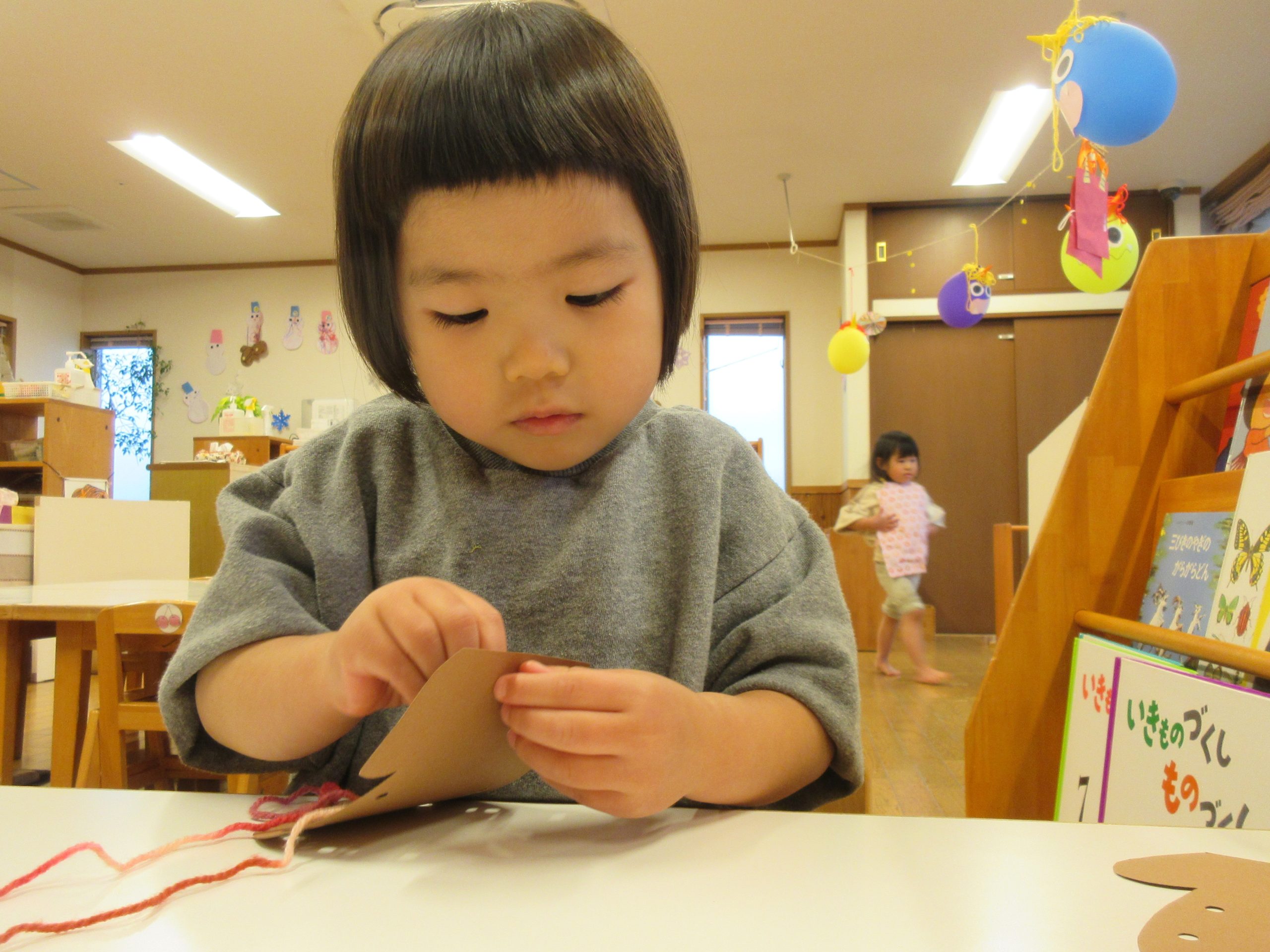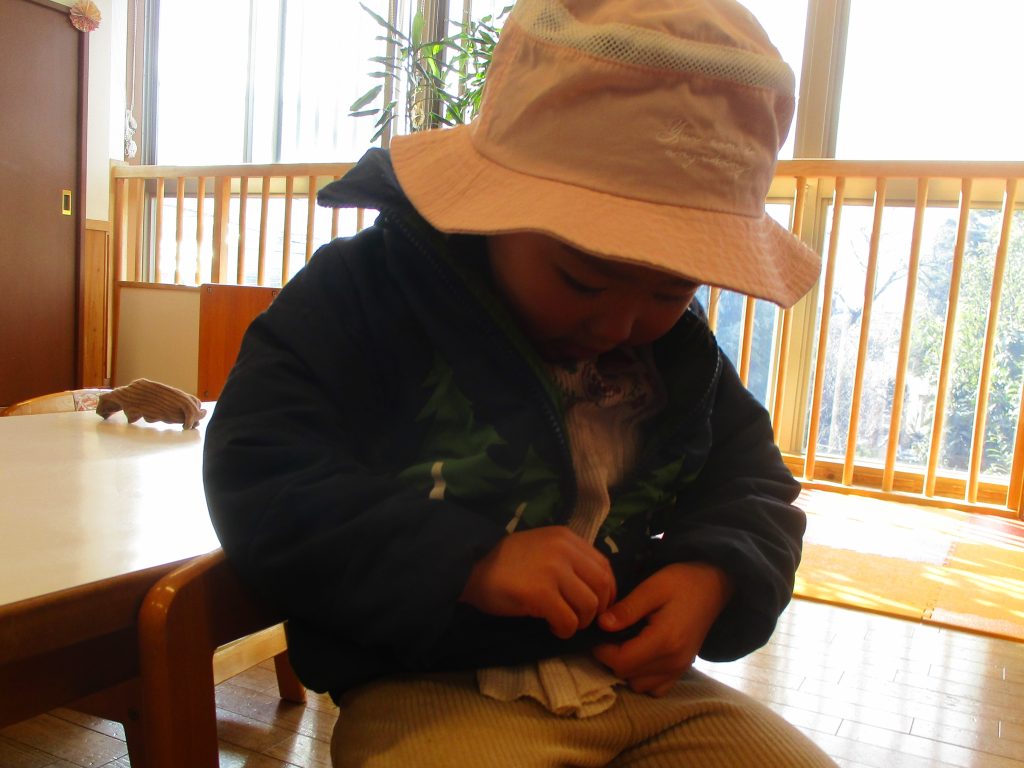 2歳児・ひばりぐみではこの一年、指先を使う活動を意識してあそびに取り入れていきました。最近では節分の製作で、人差し指を使って細かいパーツにのりを塗る、手袋型の画用紙に開いた小さな穴に、細い毛糸を通して編むということを楽しみました。毎日手にする教具や季節に沿った製作などをとおして、子どもたちの成長の段階を捉えながら指先を使うことを大事にすることで、自ずと身の回りのことが自分でできるようになってきています。指先の巧緻性の発達は、靴下を履く、上着のファスナーを締める、衣服の着脱だけでなく裏表に気づいて直すなど様々なことにつながっています。Tくんは、「むずかしい」と言いながらも靴下の履き口に指先を入れて引っぱりあげ、Sちゃんはズボンの裏表を直す際に「どこひっぱるの」と、おとなにポイントを聞きながら自分でやり遂げていました。自分でできることが増えると、こんなことも自分でできた!今度はこれも自分でやってみたい!という思いがどんどん湧いてきている子どもたちです。