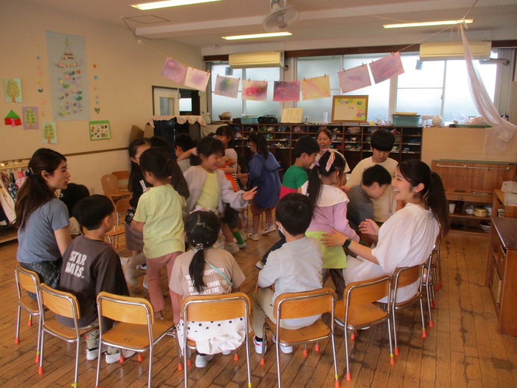 礼拝の後は、学年に分かれて皆で近況報告をしたり、ゲームや歌をうたって楽しみ、おやつを食べながらのおしゃべりは幼稚園の頃と同じようでした。