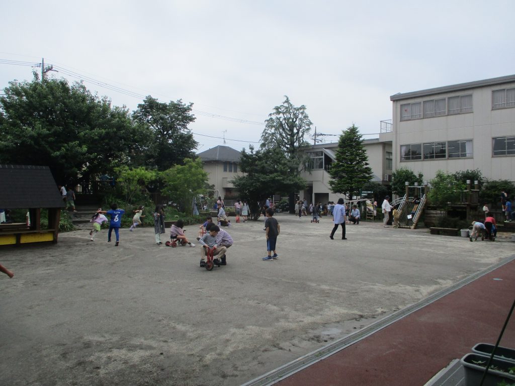 雨があがった園庭で、三輪車やブランコ、滑り台を懐かしく楽しんでいました。