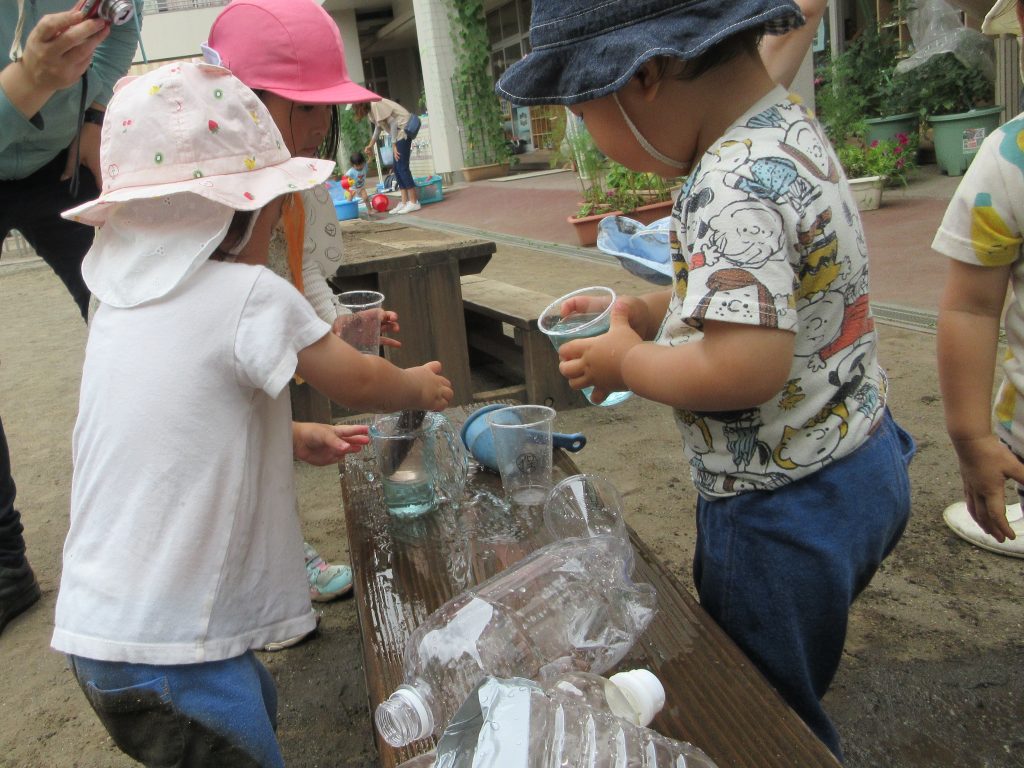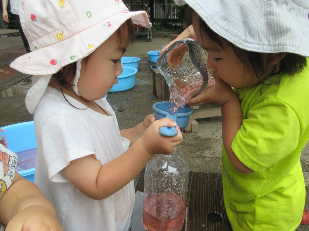 1歳児・すみれぐみの子どもたちは水に触れて涼しさ・気持ちよさを感じています。この日はみんなでジュース屋さんを開店しました。ピンク、黄色、青、タライに用意された色水に、「赤色あった!」「いちごジュースかな?」とそれぞれのイメージが膨らみます。容器も様々な形があり、口の広い容器からペットボトルの小さな口にジュースを移すのは一苦労です。Aちゃんはそんな時、近くにいたBちゃんに協力してもらうことにしました。Aちゃんが漏斗とペットボトルを支え、Bちゃんが四角い容器に汲んできたジュースを注ぎます。角から注ぐとこぼれず入ることを知っているBちゃん、容器を斜めに傾けて“こぼさずに入れるんだ!”という気迫があふれています。ペットボトルがいっぱいになるまで注ぎ、Aちゃんは「あまーいジュース!」と満足気な表情でした。