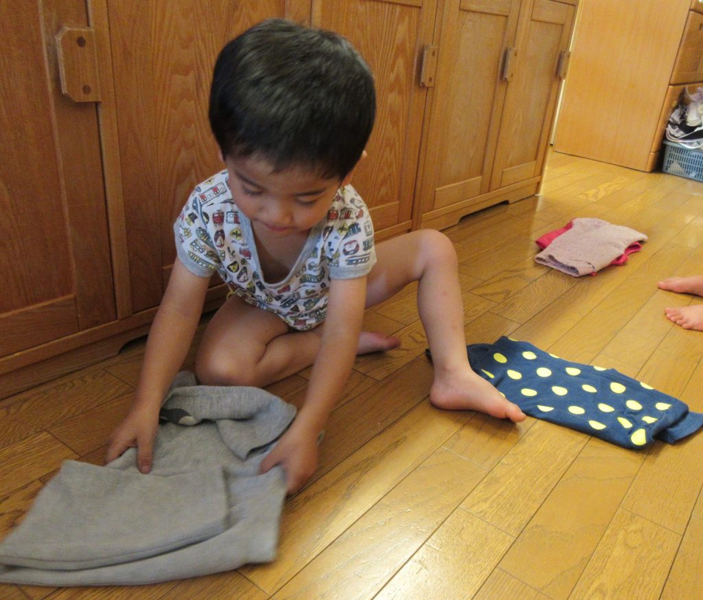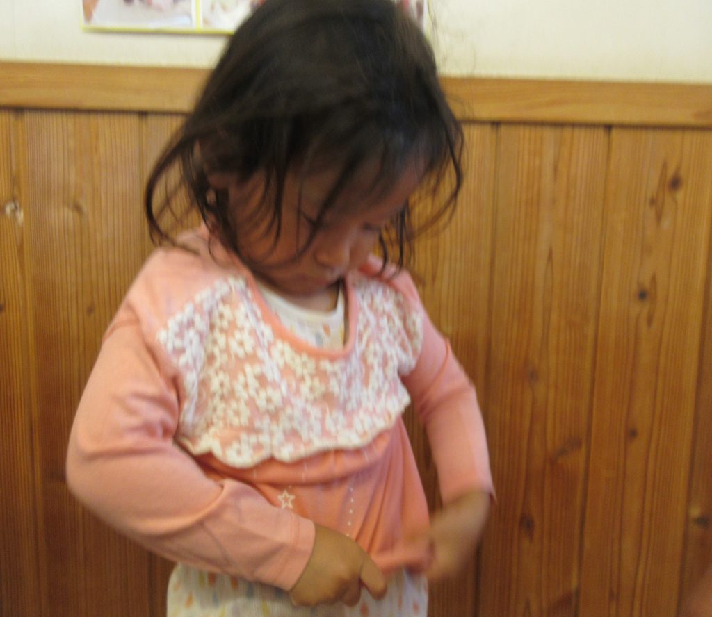 2歳児・ひばりぐみの子どもたちは、園庭でたくさん遊んで汗だくになって帰ってきました。着替えの場面では、ひばりさんはもう一人で脱いだり着たりできるので、大人は見守りながら足がひっかかったりして難しい時だけ手を貸しています。高月齢の子は服を脱いだら、表裏が逆の時は自分でひっくり返して、床に広げて畳むところまで一人でできます。低月齢も片手で服の裾をつかみながら、うまく肘を引いて袖から腕を抜くのを一生懸命頑張っています。「できないよー」と言う時は大人が「こうすると出来るよ」「お袖引っ張って、脱いでごらん」と声をかけると、自分でやろうと苦戦しながら最後までやり遂げ、「ひとりでできたよ、みてみて」と大人に嬉しさを伝えてくれます。誰かが一人で着替えているのを見て、真似して自分もやろうとすることもあり、子どもたちがお手本になってくれたりします。