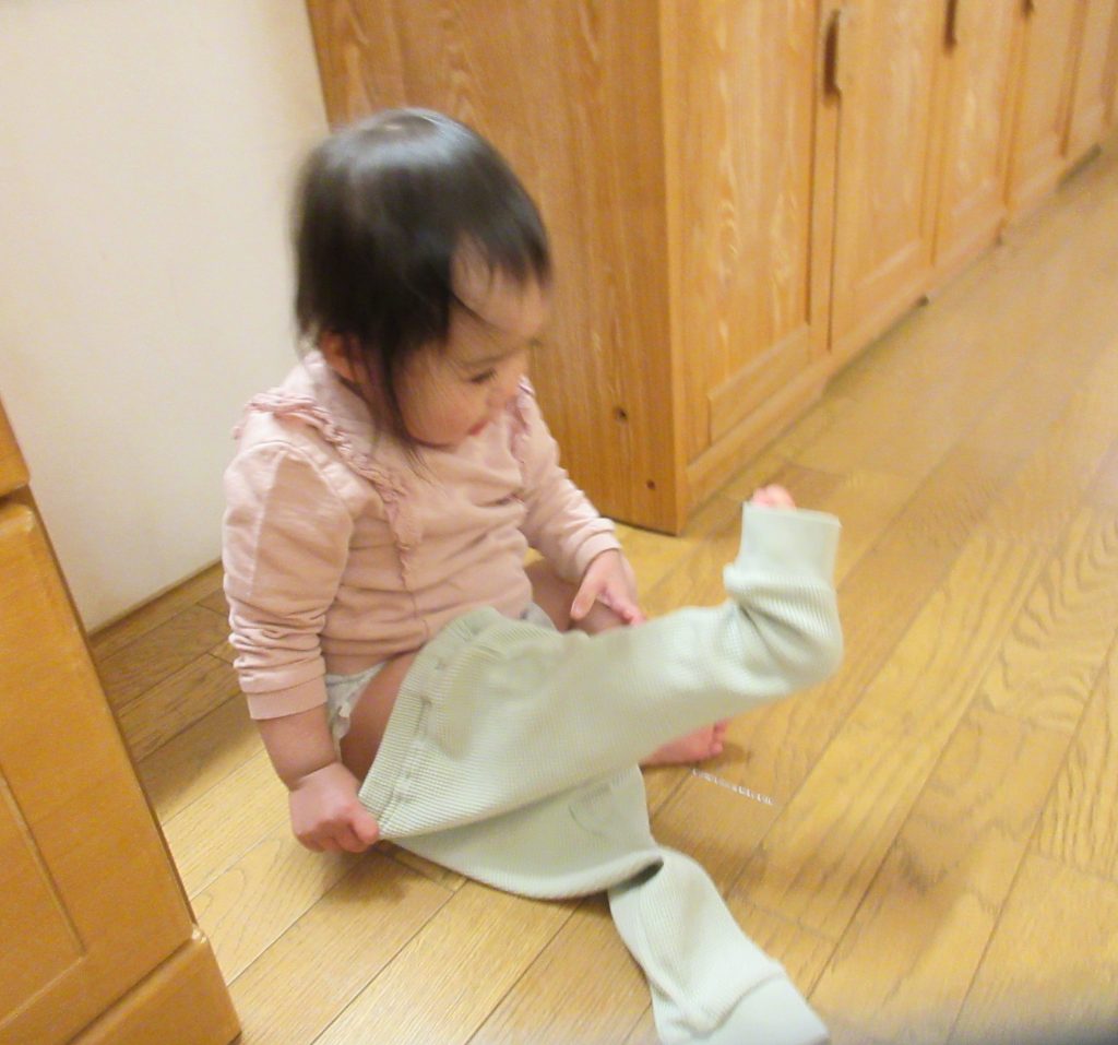 0歳児・つくしぐみの子どもたちは園庭やお散歩に遊びにいく日が増えてきました。行く前の準備や、帰ってきてからの支度などを、大人と一緒に体験しています。脱いだ靴や靴下、洋服は自分のマークのある場所に「ないない~」と言いながら入れたあと、手洗いにむかいます。ある日のこと、ズボンを履く場面でAちゃんは自分で、ズボンを持ち片足をあげてズボンの穴に入れようとします。入るまであきらめずに集中して、両足が入ると立ち上がりズボンを「んー!」と思いっきり引っぱりあげ(後ろは大人がさりげなくあげて)履くことに成功。自信たっぷりにお部屋に入っていく姿がなんとも誇らしげでした。大人と一緒に取りくみながら、まずは子ども自身のやりたい気持ちを大切にし、できた時の達成感やさっぱりした心地よさを味わえるようにしていきたいです。