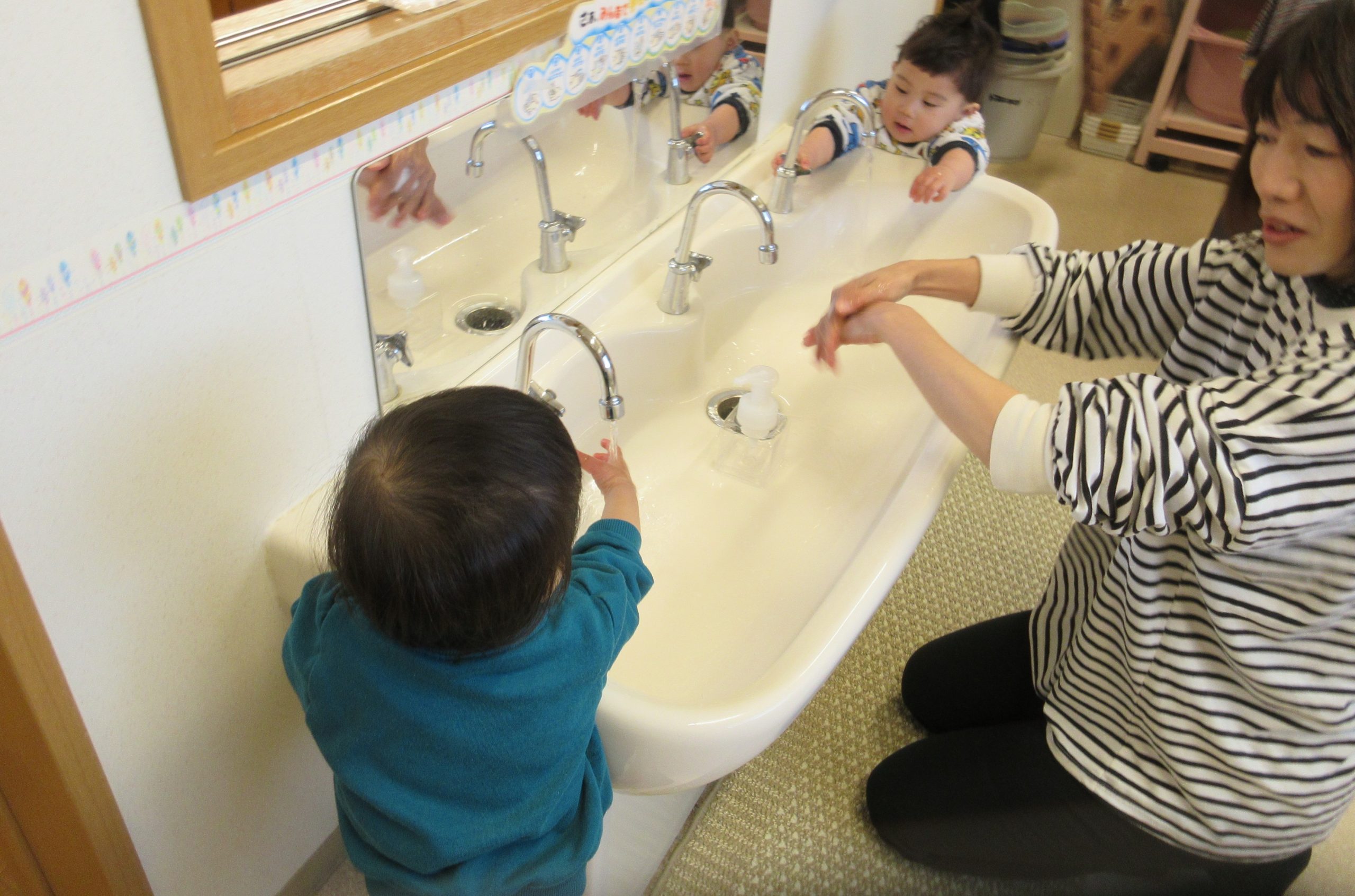 0歳児・つくしぐみの子どもたちは園庭やお散歩に遊びにいく日が増えてきました。行く前の準備や、帰ってきてからの支度などを、大人と一緒に体験しています。脱いだ靴や靴下、洋服は自分のマークのある場所に「ないない~」と言いながら入れたあと、手洗いにむかいます。ある日のこと、ズボンを履く場面でAちゃんは自分で、ズボンを持ち片足をあげてズボンの穴に入れようとします。入るまであきらめずに集中して、両足が入ると立ち上がりズボンを「んー!」と思いっきり引っぱりあげ(後ろは大人がさりげなくあげて)履くことに成功。自信たっぷりにお部屋に入っていく姿がなんとも誇らしげでした。大人と一緒に取りくみながら、まずは子ども自身のやりたい気持ちを大切にし、できた時の達成感やさっぱりした心地よさを味わえるようにしていきたいです。