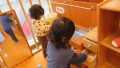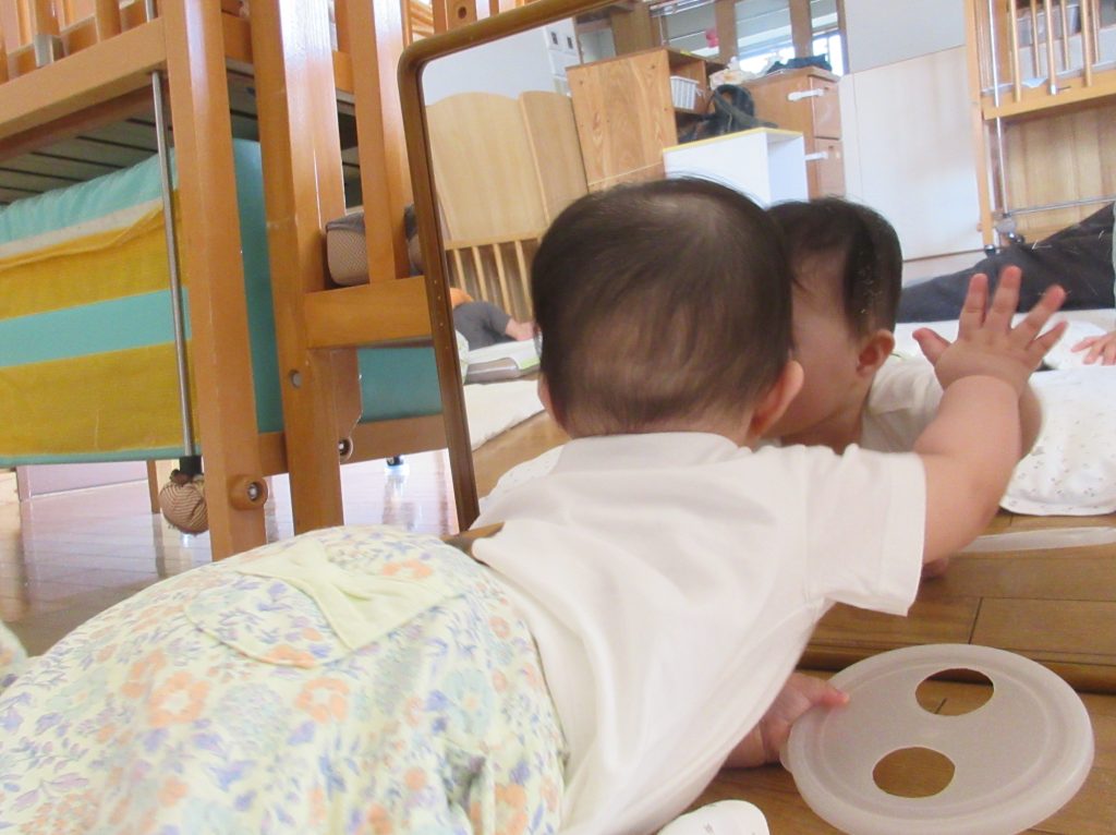 つくしぐみ0歳児の子どもたちは少しずつ環境にも慣れ、穏やかな表情をみせてくれています。お部屋では、好きな遊具に向かっていき、じっくりと触ったり振ったり思い思いにあそぶ姿が増えてきました。Aちゃんは鏡に興味津々です。自分の姿が映るとにっこり笑って、手を伸ばしてパンパンと叩いて触っていました。そこへBちゃんも“何しているの?”というように隣にきてAちゃんの様子をじっくりと見つめると“私も”と鏡を見て二人で「あー」「キャー」と声を出しながら触って楽しんでいました。