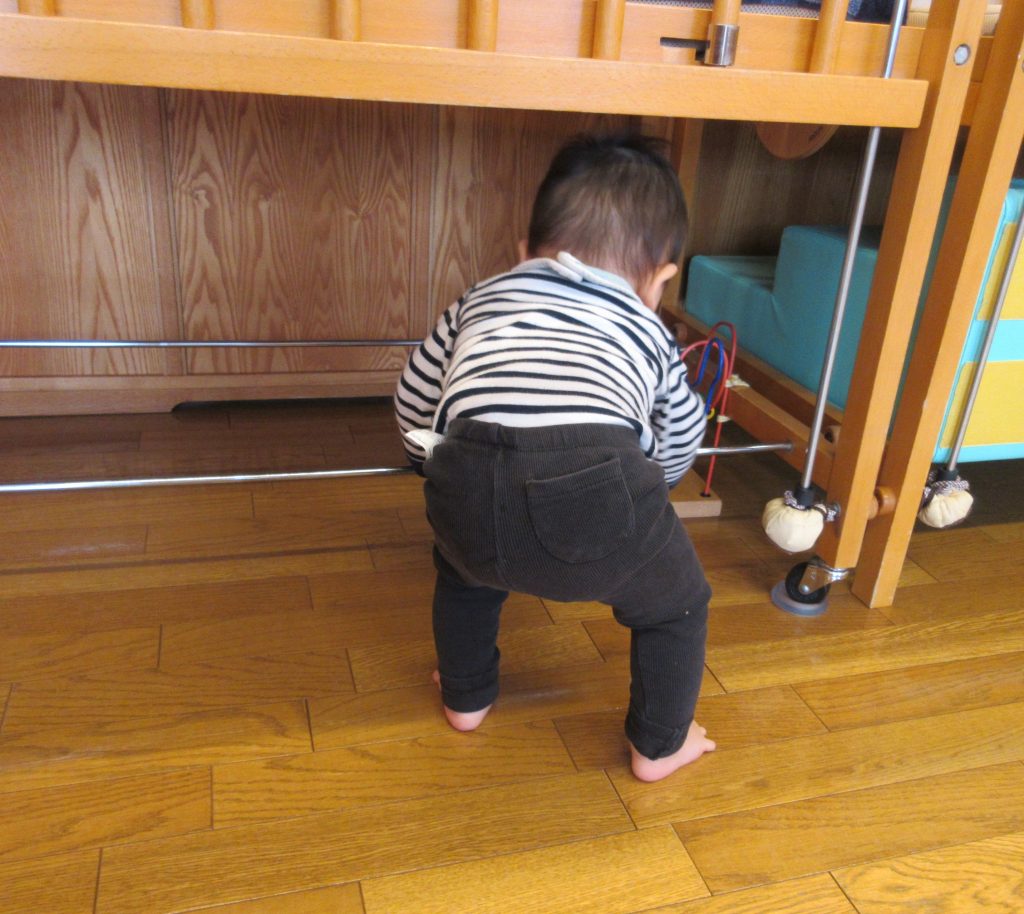 Cくんは、ベッドの下にある遊具に触りたくてなんとかくぐって入ろうとしています。しかし、棒が目の前に横たわり、なかなか入れません。Cくんなりに色々考えて足をあげたり、身体を上下に動かしたり試行錯誤していました。あきらめることなく数分後、無事に入ることに成功すると「へっ!」と喜びの声をあげていました。子どもたちの“やってみたい”気持ちを大切にして、わくわくする楽しい環境づくりを心がけていきたいです。