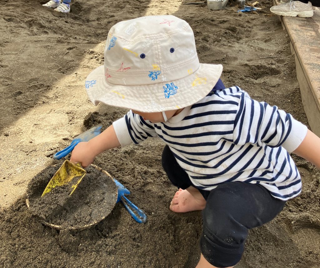 1歳児すみれぐみの子どもたちは、神田川や園庭などの戸外でのびのびと過ごしています。この日も園庭へ。雨上がりの日で砂がしっとりとしていました。Aくんは砂場でお皿からアイスのように砂をすくうと、「どーじょ(食べていいよ)」と大人の口元に持ってきてくれました。「おいしい!」と言う大人に「おいしっ」とにんまり笑顔なAくん。