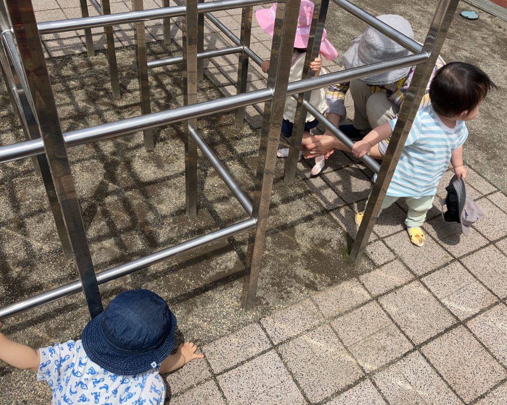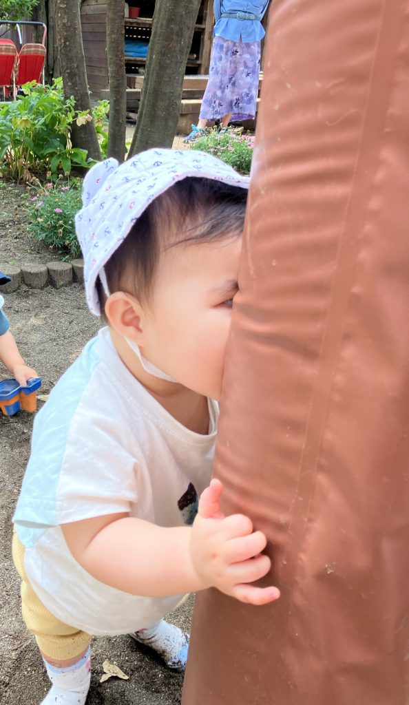 0歳児つくしぐみの子どもたちは、5月になってから園庭に行くことが増えてきました。最初は初めて見る大きい遊具やたくさんのお友だちに圧倒されていたつくしぐみでしたが、バギーにもすっかり慣れて園庭の様子をキョロキョロと見渡しています。Aちゃんは砂場の近くにある円柱に隠れていないいないばあ。他クラスの大人にもやってみせると「かわいい~」と言われ、ちょっぴり恥ずかしそうにしながらも、にっこり笑顔になるAちゃんでした。そしてBくんは地面に降りるとハイハイであっちにいったり、こっちにいったり、園庭内を探索します。ジャングルジムを見つけるとしっかりかがんで中に入っていき、棒につかまり立ちをしました。大人が間から顔を出すと、“ぼくここまで入ったよ、すごいでしょ”と得意げな表情のBくんでした。