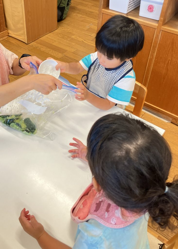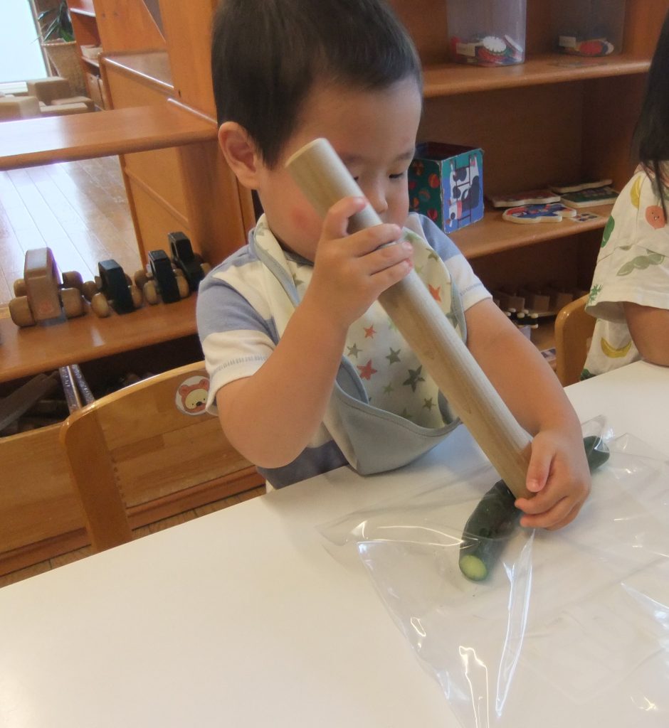 2歳児・ひばりぐみのこどもたちは、自分たちでで育ててきた夏野菜を収穫し、4本のきゅうりで〈たたききゅうり〉を作ることにしました。栄養士のさきさんに作り方を見せてもらうと、きゅうりをパンパン!トントン!と叩く音を聞いて、子どもたちも「やりたい!」と意欲的になり、めん棒を当てて、「きゅうり、バラバラになったよ」笑顔になります。叩くのを遠慮していたCくんも塩もみは積極的に参加していました。もんでいくうちに「水が出てきたよ」「(触り心地が)ちがう」とさまざまな発見がありました。3つのテーブルで1本ずつ作った〈たたききゅうり〉の出来たてをみんなで味見しました。普段野菜を食べない子も「もっと!」とおかわりする子も、みなキラキラした表情で味わっていました。その後の給食にきゅうりが出てくると「これはひばりさんが育てたきゅうり?」と尋ねる声もきかれます。いろいろな食材と出会い、気づき、お友だちと調理に参加して、楽しさを分かち合う体験をしていきたいです。