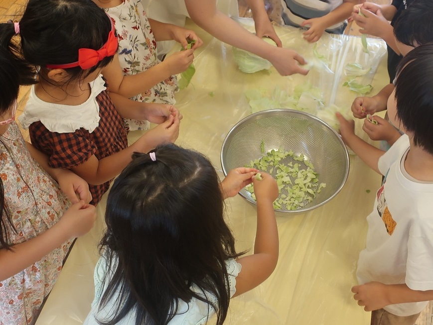 おやつのお好み焼きのキャベツをちぎって、焼き立てを食べたり、