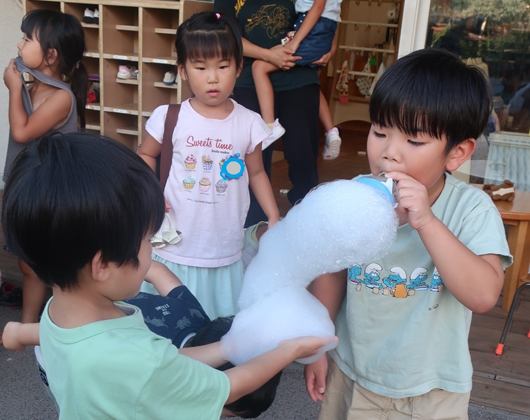 玉成幼稚園は子育て支援のため夏休みも保育を行っていますので、毎日たくさんの子どもたちが元気に幼稚園で過ごしています。