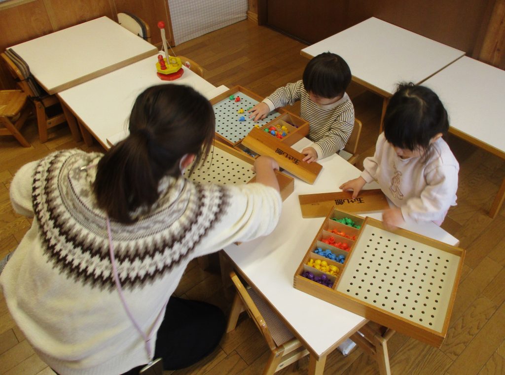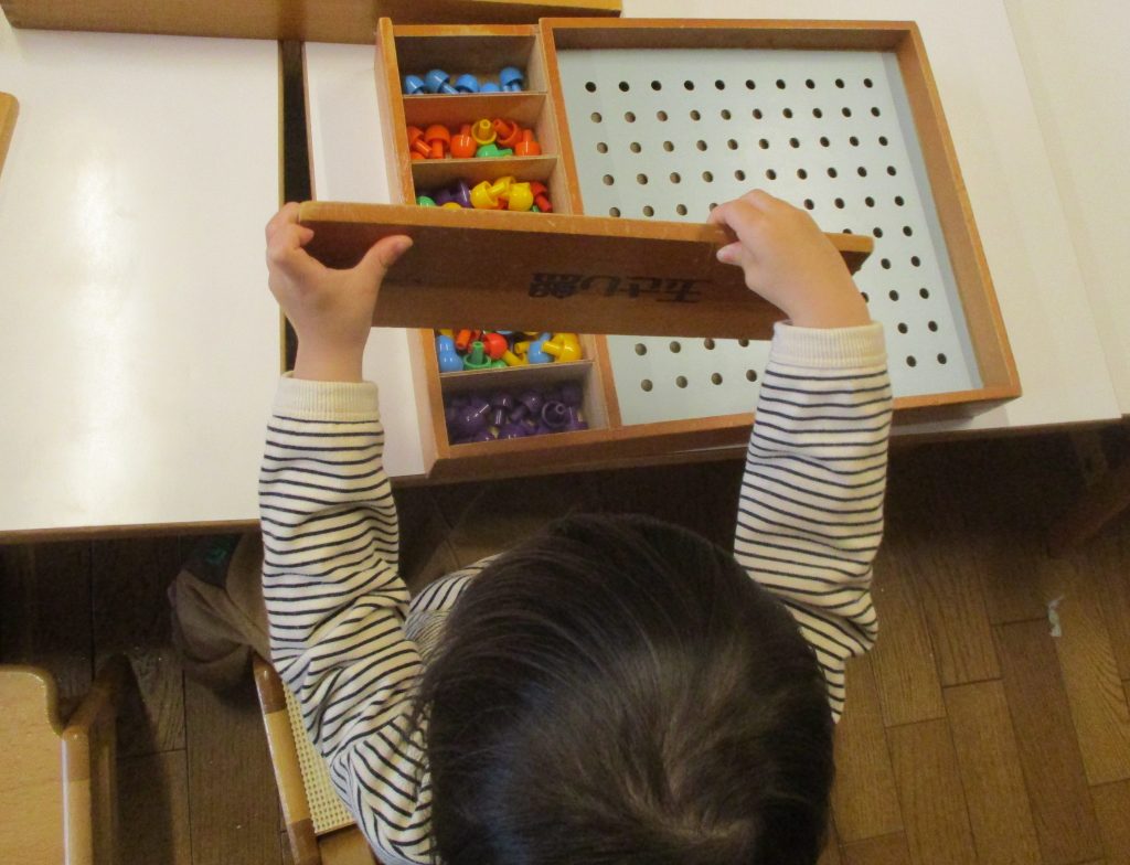 1歳児・すみれぐみの子どもたちは指先が少しずつ器用になり「つまむ」あそびも楽しめるようになってきました。Aくんはおとなが差して一列に並べた玉の頭を人差し指でツンツン触ったり、指でつまんで持ち上げていました。Bくんはつまんで沢山出した玉を、板の上手で転がすと「ガラガラ」と音がするのを楽しんでいました。Cちゃんは並べてあそんだあと、色別のケースに玉を片付けたら自分でふたを閉めたくて「こっち?こっち?」と、ふたを縦横に動かし、溝にはめる方向を確かめて頑張っていました。同じ教具でも、子どもたちがそれぞれの楽しみ方を見つけています。