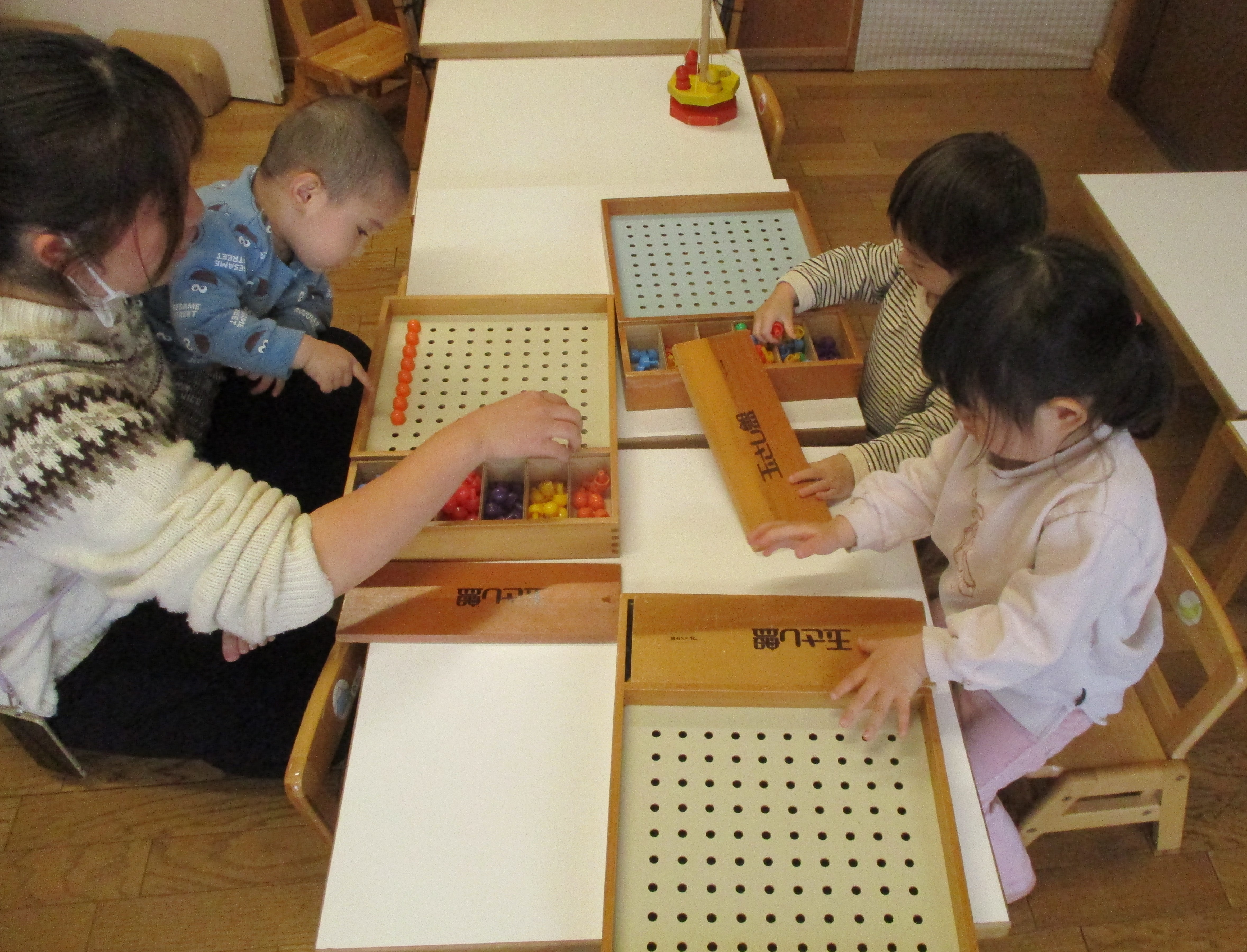 1歳児・すみれぐみの子どもたちは指先が少しずつ器用になり「つまむ」あそびも楽しめるようになってきました。Aくんはおとなが差して一列に並べた玉の頭を人差し指でツンツン触ったり、指でつまんで持ち上げていました。Bくんはつまんで沢山出した玉を、板の上手で転がすと「ガラガラ」と音がするのを楽しんでいました。Cちゃんは並べてあそんだあと、色別のケースに玉を片付けたら自分でふたを閉めたくて「こっち?こっち?」と、ふたを縦横に動かし、溝にはめる方向を確かめて頑張っていました。同じ教具でも、子どもたちがそれぞれの楽しみ方を見つけています。
