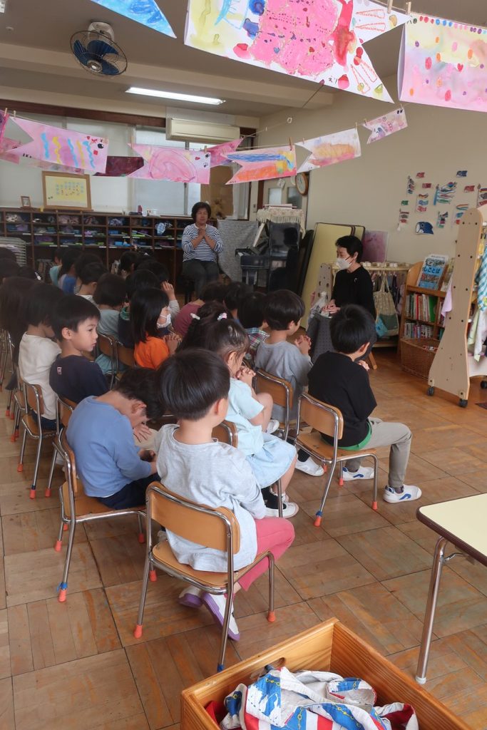 年長組と年中組はイースター礼拝を守り、園長よりイースターのお話を聴きました。
