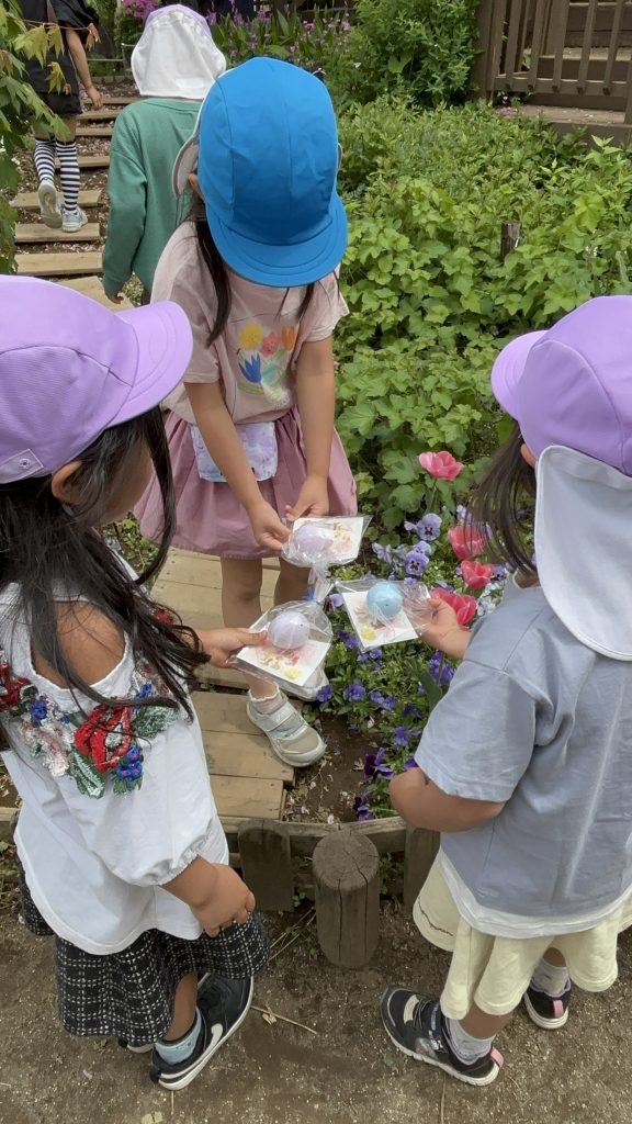 バタフライガーデンのお花の影や植え込みの中にイースターエッグを見つけると、嬉しそうに「あったよ!」と友だちや保育者に見せていました。