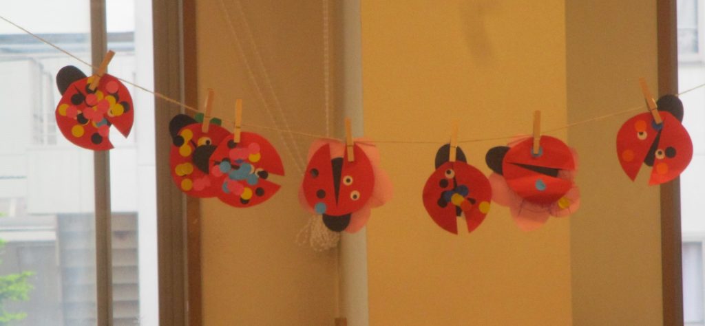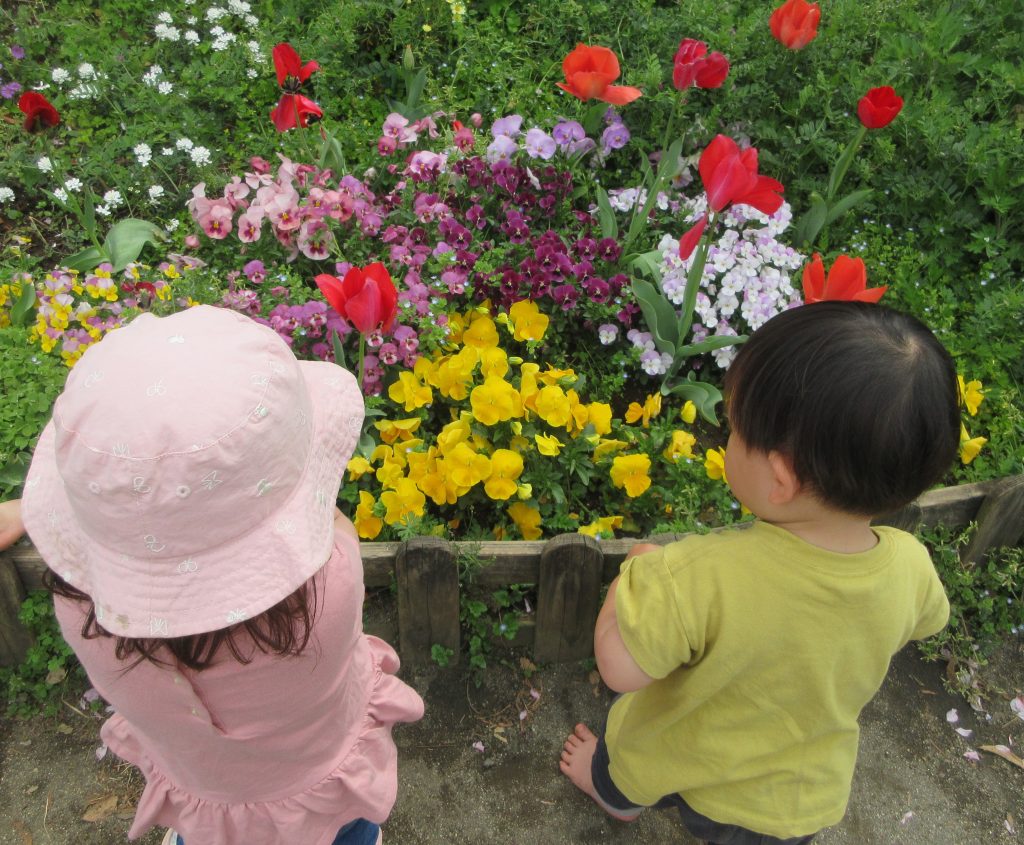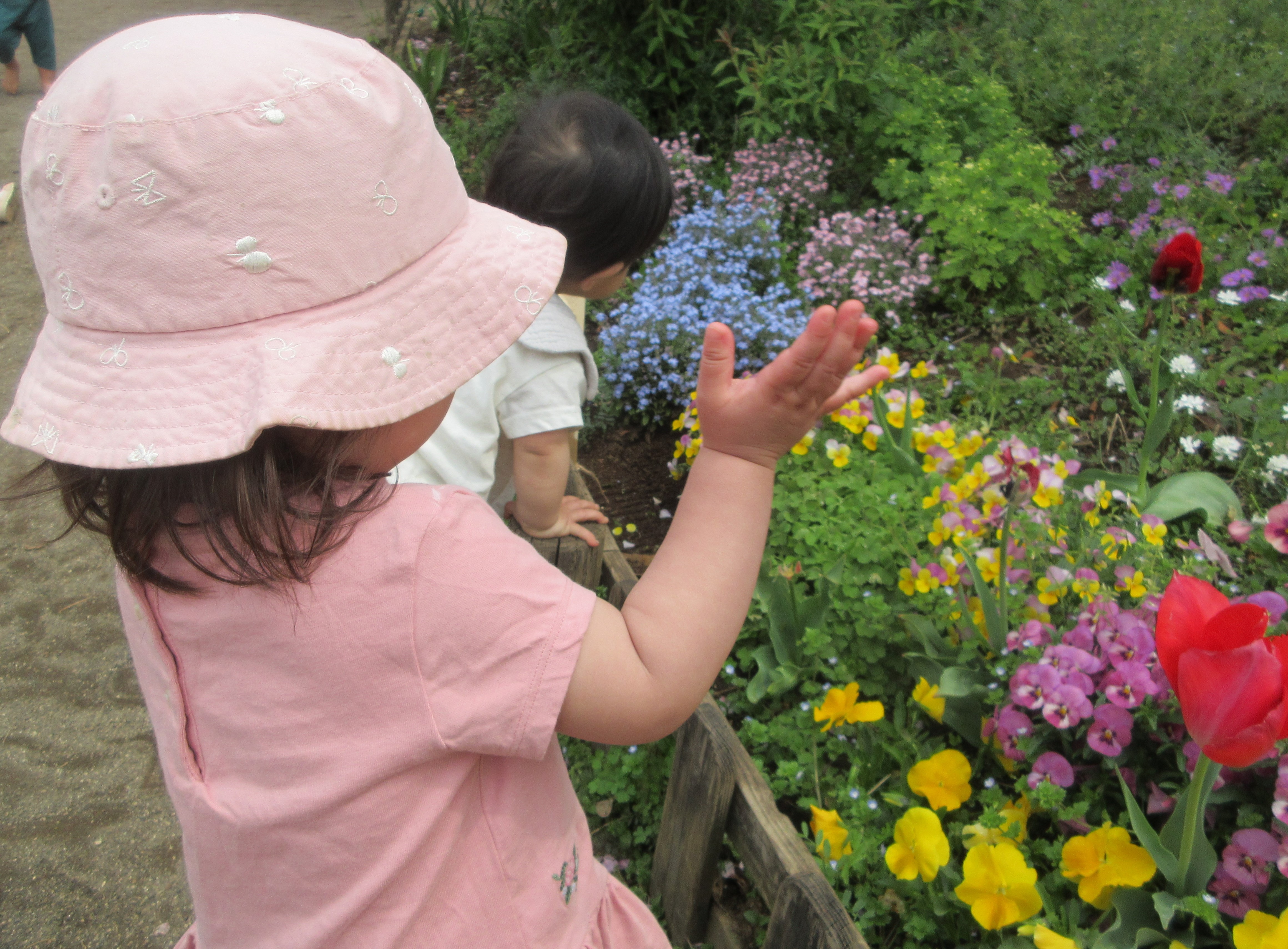 1歳児すみれぐみの子どもたちは、築山の小道の登り下りやバタフライガーデンのお花見をして春を感じています。バタフライガーデンを“じーっ”と見ていたAくんは、テントウムシを発見。「てんてん(む)しー」と、指さして大きな声で教えてくれました。Aくんはテントウムシが飛んで行ってしまったことを、お部屋に帰ってからも絵本のテントウムシのページを見ては思い出していたので、シール貼りをしてテントウムシの製作をしました。実際に体験したことが、記憶に残りあそびへつながっていました。