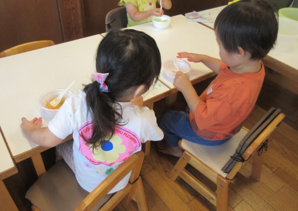 2歳児・ひばりぐみの子どもたちは先日、かき氷あそびをしました。おとながかき氷機で削り始めると、「お祭りで食べたよ」と興味津々。食紅で赤、黄、緑の色水を用意していたので、「○〇は黄色にするの」「△△はメロン(緑)にしたい」と早くかき氷が欲しいことが表情や机から身を乗り出す姿で伝わってきました。Aくんは「赤も入れてみたい」「緑も入れてみたい」と全部の色を入れて混ぜ始めました。すると「この色は紫?」目の前に座っていた子もAくんのかき氷の色を覗いて「黒じゃない?」と色の変化について話し合っていました。またBちゃんはかき氷を握って「丸くならないね」「固まらない」と言いながらも嬉しそうに手の中に入れて握っていました。Cくんは器に入ったかき氷をスプーンで混ぜて「お水出てきた」「もっとやるの」と30分以上じっくりあそんでいました。