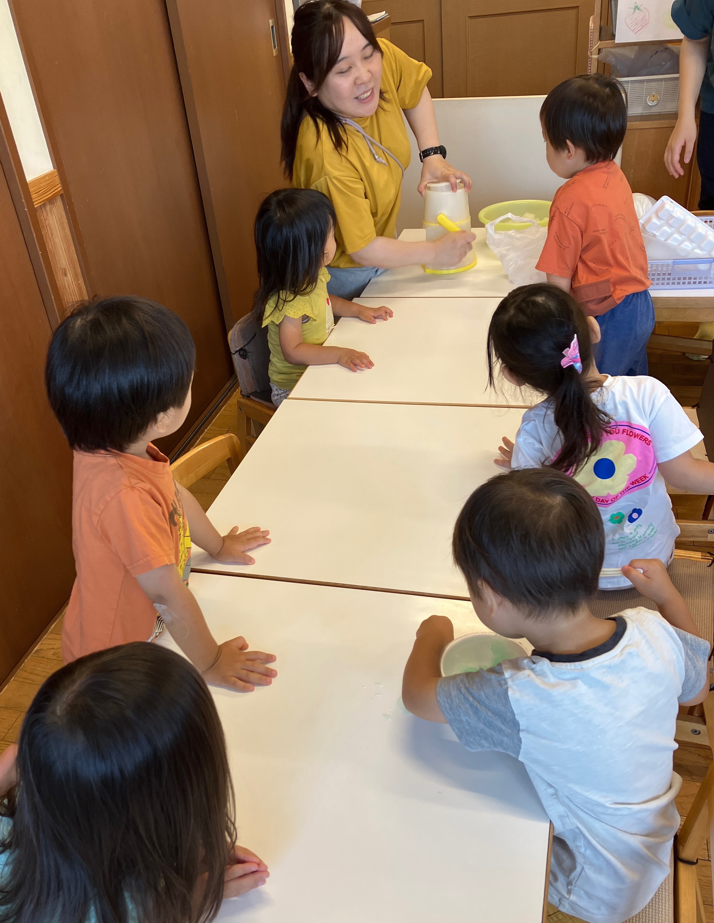 かき氷あそびや今までの体験を通して、“どうしてなんだろう?”“こうやったらどうなのかな?”などさらに探求心が生まれ、“素材”のおもしろさに夢中になっています。子どもたちの好奇心を大事にして、不思議発見を一緒に楽しんでいきたいです。