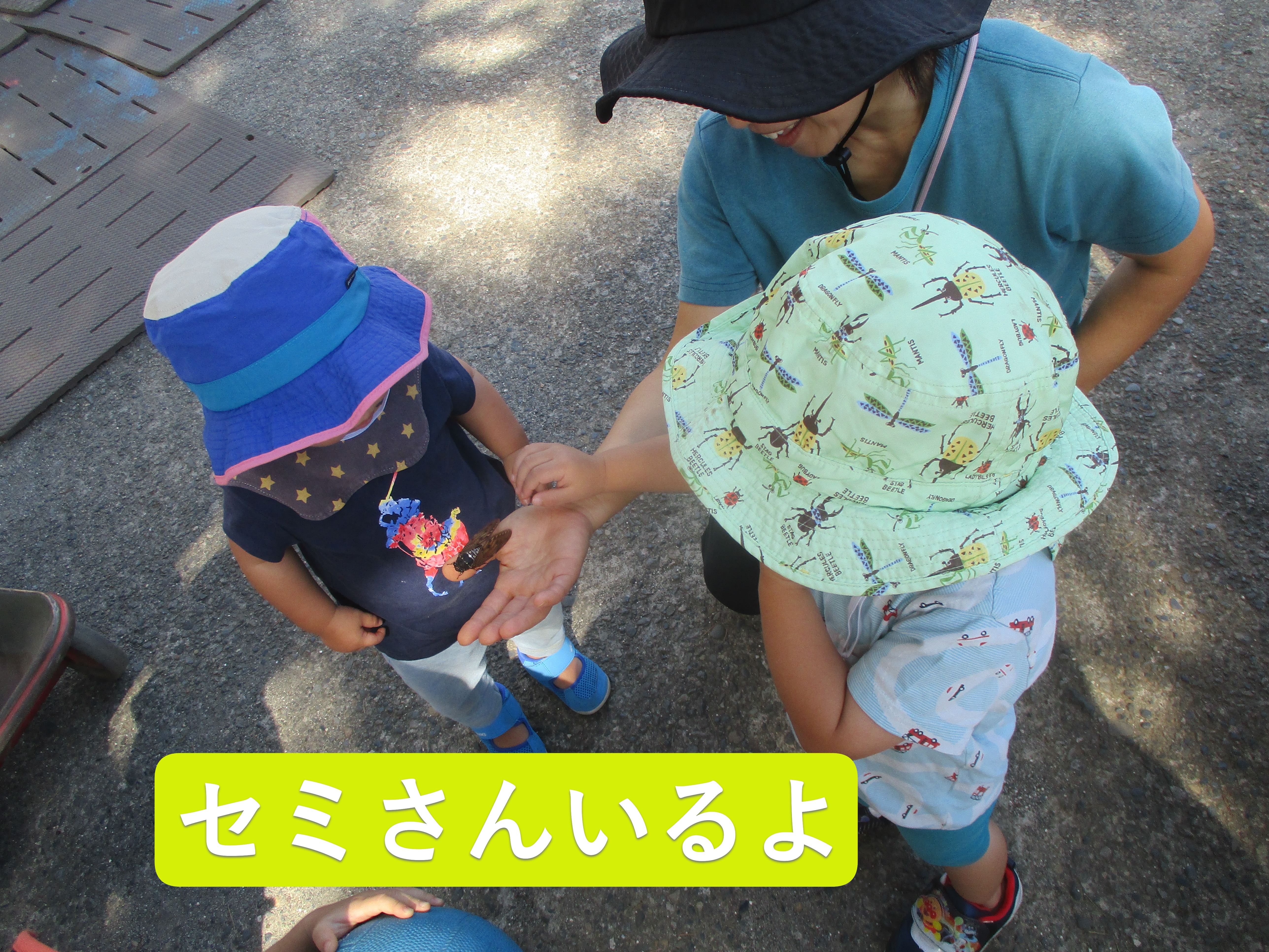 1歳児・すみれぐみの子どもたちは園庭に行く支度を済ませ玄関を出ると、テラスにセミがいました。子どもたちはしゃがんで「じーっ」とみていました。「セミさんも園庭に連れて行こう」と大人が、捕まえて園庭に行くことにしました。園庭で子どもたちは順番に「セミさんいるよ」と、輪になって見たり、ツンツンと指で触ろうとしていました。大人が手の平にのせてみると、ドキドキしながらも掴んでみようとする子もいました。0歳児のつくしぐみの子が園庭に来ると「セミさんいるよ!」「見てみて」と大きな声で教えてあげていました。園庭あそびが出来る季節になり、他にもダンゴムシやミミズ、バッタなどの虫にも興味を示している子どもたちです。
