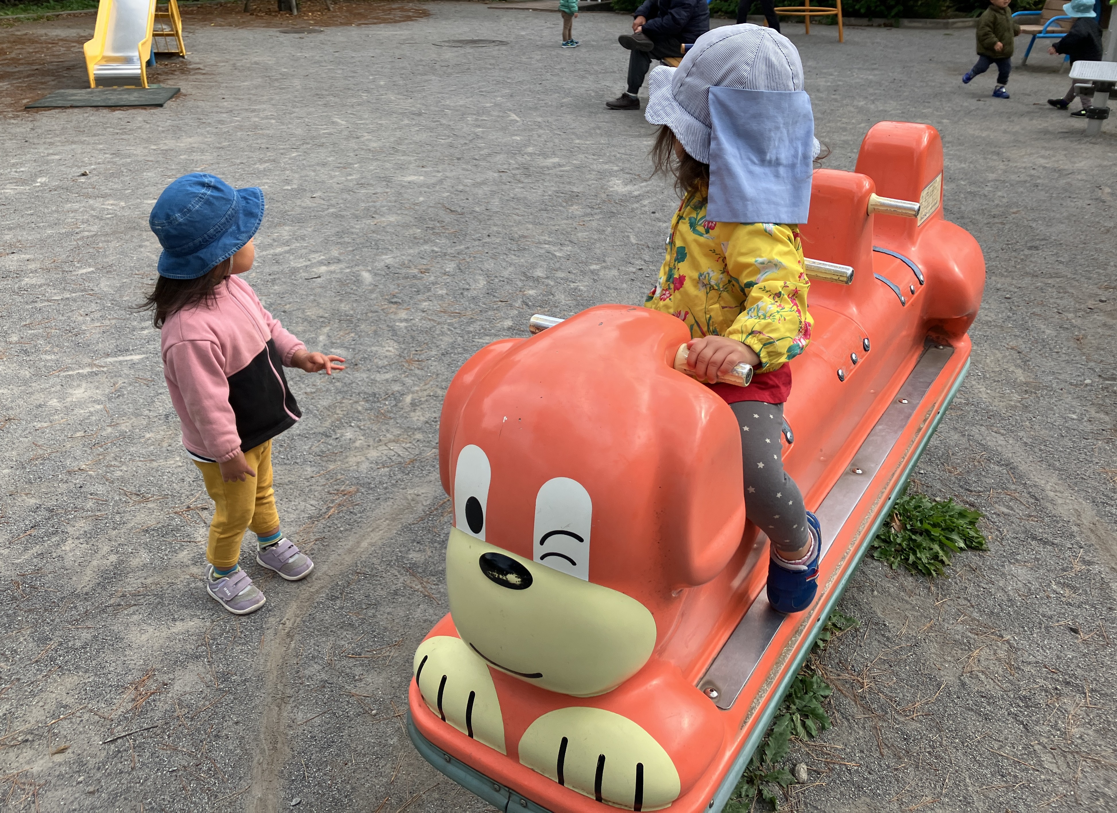 子どもたち同士の貸し借りで前ならば「貸して」と聞くと「だめ」と答えることがありました。貸してもらえないと泣いてしまうことや、ぱっとお友だちのものをとってしまうことがあり、おとなが間に入って互いの思いを代弁して関わってきました。ある日、Aちゃんはお友だちがロッキンパッピーの先頭に乗っているのをみると、自分も先頭に乗りたくて「かわって」と聞くと「だめ」。Aちゃんは「Bちゃんに貸してって聞いたのに貸してくれない!」とおとなのところにどうにかしてほしいとやってきました。おとなが間に入って解決することは簡単ですが、園では友だち同士でやり取りし解決していくことで、他者との関係を築く力を養うことを大事にしています。おとなが「Bちゃんはまだ乗りたいんじゃない?聞いてみたらどうかな?」と返すと、解決してくれないことにもどかしい表情のAちゃんでしたが「貸して」ともう一度Bちゃんに聞きました。Bちゃんは「まだ乗りたいの」Aちゃんが「10数えたら貸して!1~2~7~7~7」と数えていくとBちゃんが「いいよ」と貸してくれたのです。Aちゃんは「ありがとう」と言って嬉しそうに乗っていました。