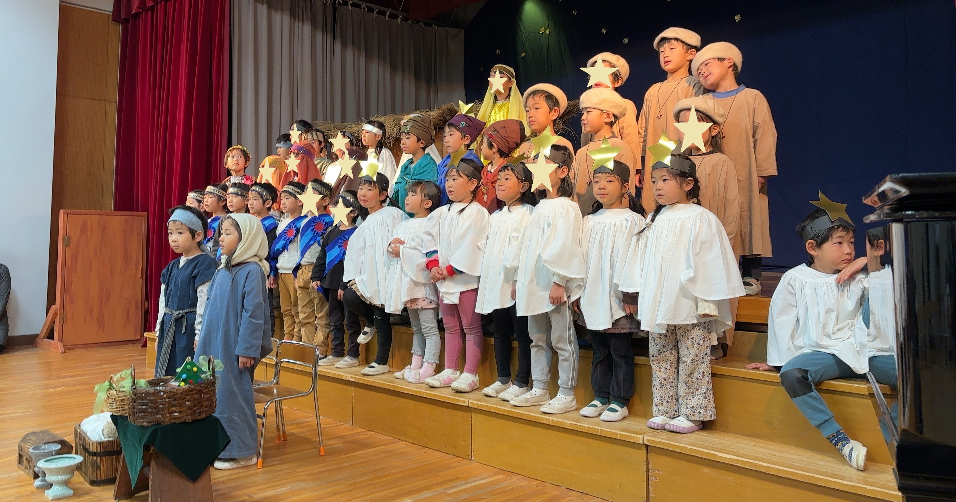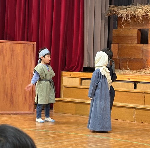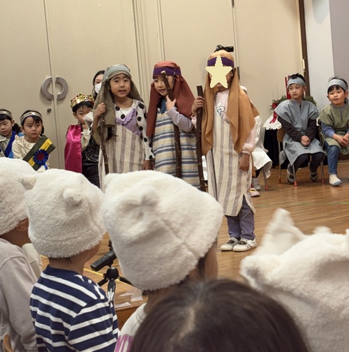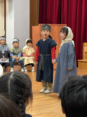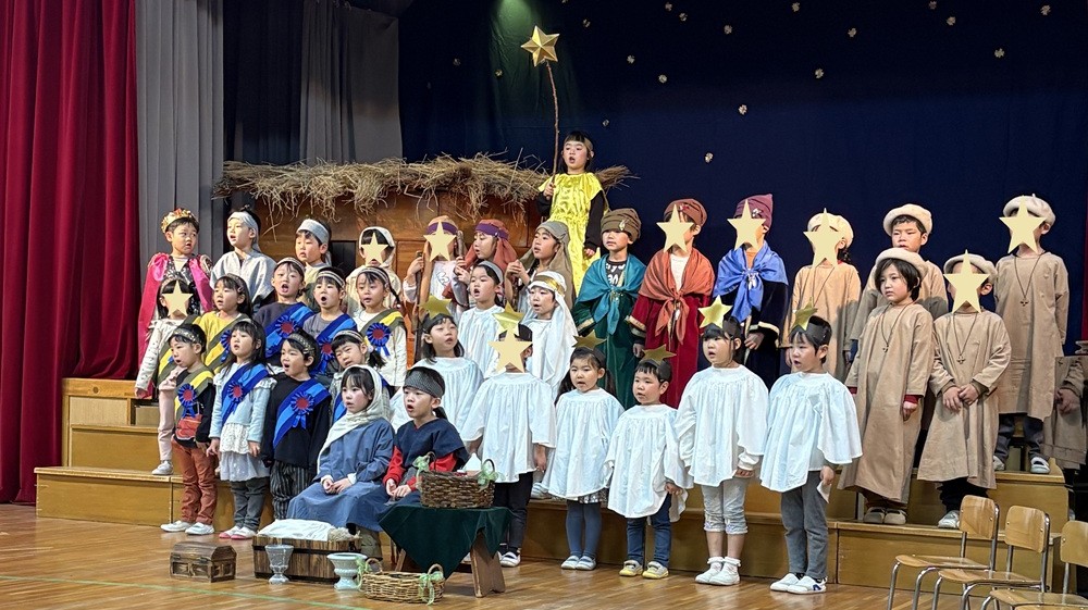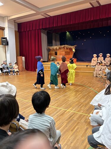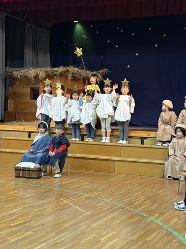 クリスマス・ページェント 幼稚園トピックス 2025.12.22 幼稚園トピックス玉成幼稚園 12月17日(水)は、うみぐみ、ゆりぐみ、ひつじぐみ、はとぐみのクリスマスでした。翌日の18日(木)は、うみぐみ、ばらぐみ、ろばぐみのクリスマスでした。年長組を中心に、年中組と年少組がイエス様の降誕劇を演じました。 聖書に書かれた一番初めのクリスマスの出来事を、子どもたちは一生懸命演じました。 クリスマスおめでとうございます! 神様の平和が世界中に訪れますように!