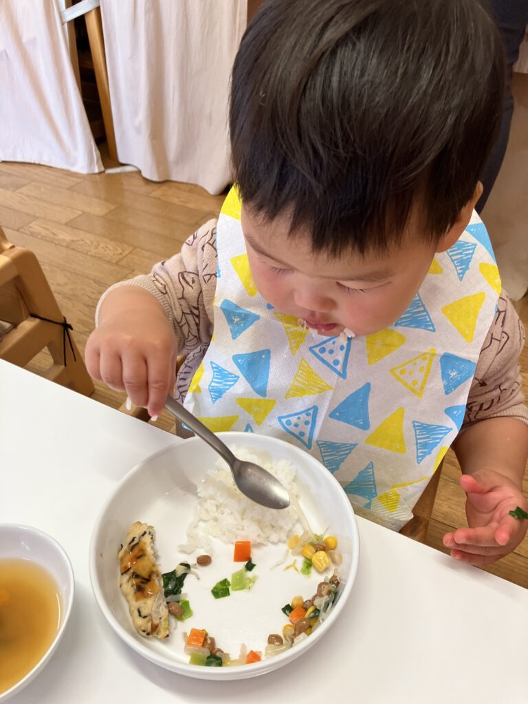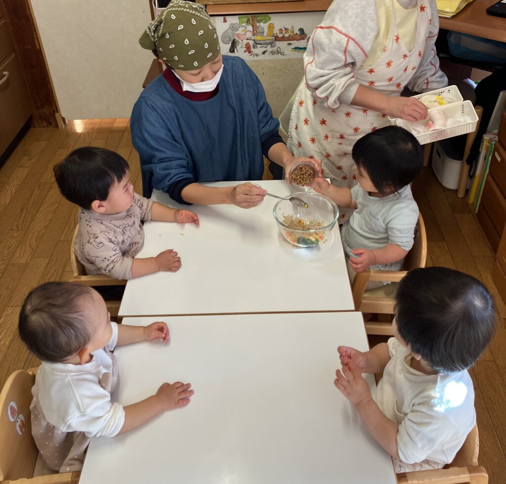 つくしぐみでは、さまざまな食材への興味と、食べる意欲を育てることを大切にしています。先月は数回に渡り、副菜の納豆サラダを栄養士と一緒に混ぜる体験をしました。まずは、子どもたちの目の前で栄養士が混ぜているのを見るところから始めていきました。すると、自然と子どもたちの手がすっと伸び、「やってみたい」という思いが表れるようになりました。Aちゃんはボウルを引っ張り、自分の目の前まで持ってきて、のぞきこみます。具材の色やにおいを感じとると、スプーンを握り動かします。「まぜまぜまぜ」と大人が声をかけることで、もっとやってみたくなっていました。完成した和え物を目の前で盛り付けてからお祈りをすると、真っ先に納豆サラダに手が伸びたのは、終始じっと見守っていたBちゃん。「食べてみたい」という気持ちが募っていたのでしょう。これからも、「おいしくたのしく食べる」ことができるように、いろいろな体験を積み重ねていきたいと思います。