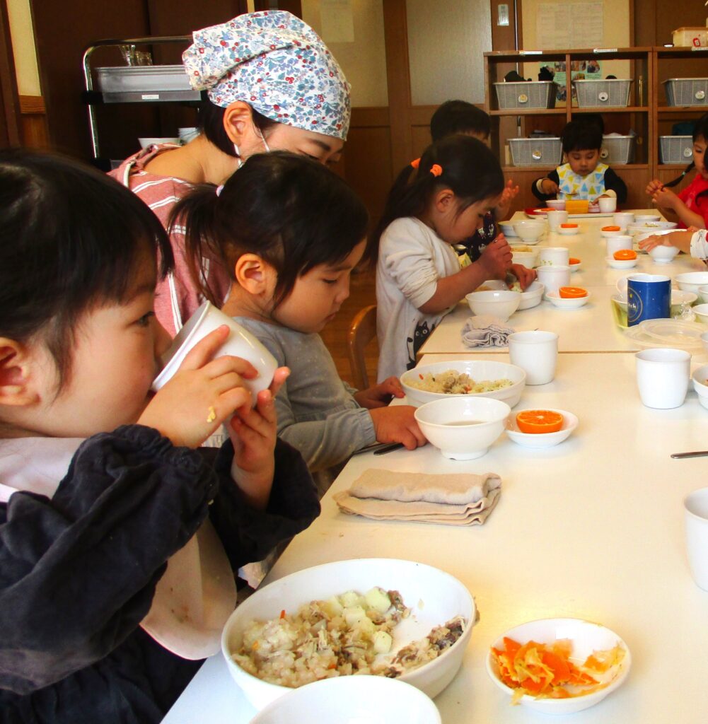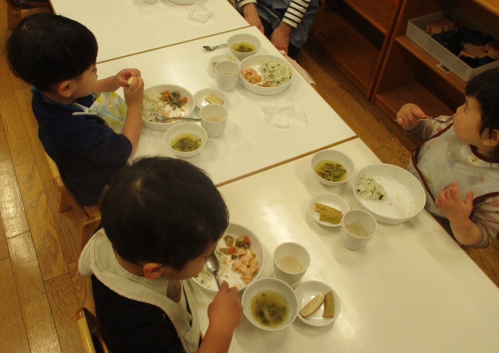 みんなで一緒に食卓を囲んで、共に食べることを〝共食〟と言います。家族やお友だちとたのしく食事をすることで、コミュニケーションが取れたり、食習慣が身に付き食への興味も出てきます。しかし近年では、様々な〝こ食〟が増えており、その中でも一人で食べる〝孤食〟が多くなっています。ご家庭ではいかがでしょうか?子どもたちからは度々、「昨日パパとママと〇〇に行ってごはん食べたよ」「○○をみんなで食べたことあるんだよ」と教えてくれます。その時の表情はとても嬉しそうです。特にパパママと食べたものは、よく覚えているものですね。家事に仕事に忙しい毎日ですが、お子さんたちは一緒に食べるその時間が、安心する・ほっとする時間になっていると思います。年度の後半には、栄養士がひばりぐみに入り、一緒に給食を食べる機会を作っています。子どもたちは「お野菜食べるよ、見ててね」と口を大きく開けて食べる姿を見せてくれました。「これはだれが作ったの?」「○○さんの好きな食べ物は何?」など、会話も弾みます。そして「次はいつ来るの?」「○○さんも来てね」と、子どもたちは次の機会を心待ちにしていました。誰かと食べて嬉しいな・たのしいなと感じられる時間を、保育園でも大切にしていきたいです。