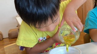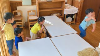 2歳児・ひばりぐみのある日の午後、AちゃんがBくんに「追いかけて」とあそびに誘いました。Bくんはその気持ちに応え「がおー」と言いライオンになって追いかけ始めました。それを見たCくんも加わり、室内を悠々と闊歩し始めます。Aちゃんが「きゃーきた...
