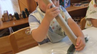 2歳児・ひばりぐみのこどもたちは、自分たちでで育ててきた夏野菜を収穫し、4本のきゅうりで〈たたききゅうり〉を作ることにしました。栄養士のさきさんに作り方を見せてもらうと、きゅうりをパンパン!トントン!と叩く音を聞いて、子どもたちも「やりたい...
