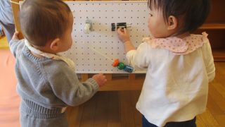 0歳児・つくしぐみの子どもたちは、階段の上り下りや、歩く走るなど大きく身体を動かすのが楽しくなってきました。また同時に手や指先を細かく使うあそびも好きになっています。手作りのビジーボードには、子どもが興味のあるスイッチや鍵・ファスナー・木製...