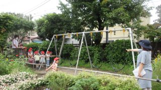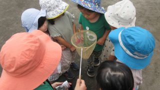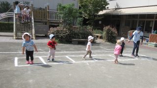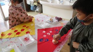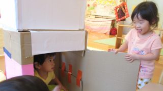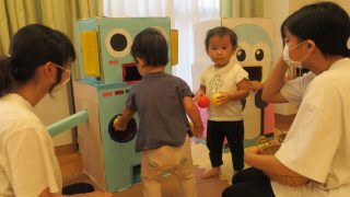 1歳児・すみれぐみの子どもたちは、多目的室へあそびに行くと かわいいペンギンやロボットの形をしたダンボールをみつけました。Cちゃんが「アルウィン祭のとき、あそんだのだ!」と、アルウィン祭当日はお休みしていたRくん、Sちゃん、Kちゃんに教えて...