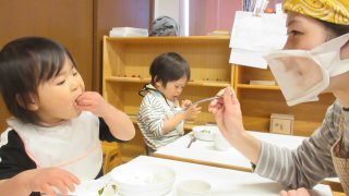 先日1歳児・すみれぐみのこどもたちは食べることが大好きで、給食の時間をいつもたのしみにしています。ブロッコリーの房を小さくちぎったり、玉ねぎの皮をむくお手伝いも体験しています。給食の時間におとなが「さっき皮をむいた玉ねぎが入っているよ」と伝...