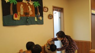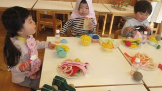 0歳児・つくしぐみの子どもたちは、身体を動かすあそびが大好きです。プレイソファからヨギボーにジャンプしたり、フラフープをまたいだり、室内を広くしてあそべる時間を作っています。牛乳パックに詰め物をしてロの字に組んだもの(ロノジーと呼んでいます...