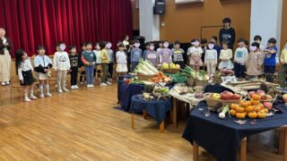 11月12日(水)は収穫感謝祭でした。前日に、子どもたちが収穫感謝礼拝に飾る野菜や果物を持ち寄りました。年長さんがバケツ栽培で収穫した稲穂や、木の実や松ぼっくりや落ち葉も一緒に飾りました。礼拝では、一番初めの収穫感謝祭のお話を、園長先生から...